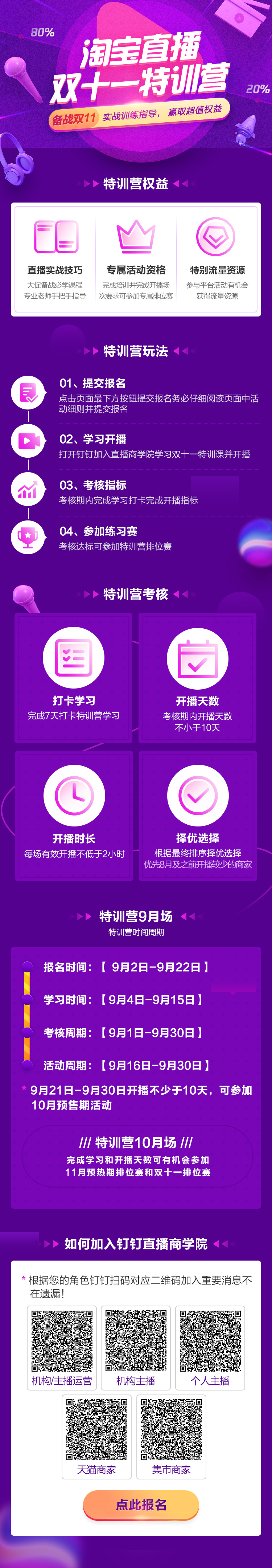 报名时间:9月2日-9月22日(报名并加入钉钉淘宝直播商学院架构,并且商家在9月开播,保证开播频次)