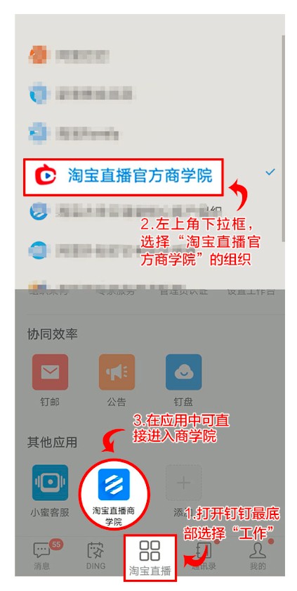 第二步:加入淘宝直播商学院架构:商家可在报名2-3个工作日后打开钉钉,登陆报名登记的手机号码账号,按照以下截图图示确认是否加入淘宝直播商学院组织:
