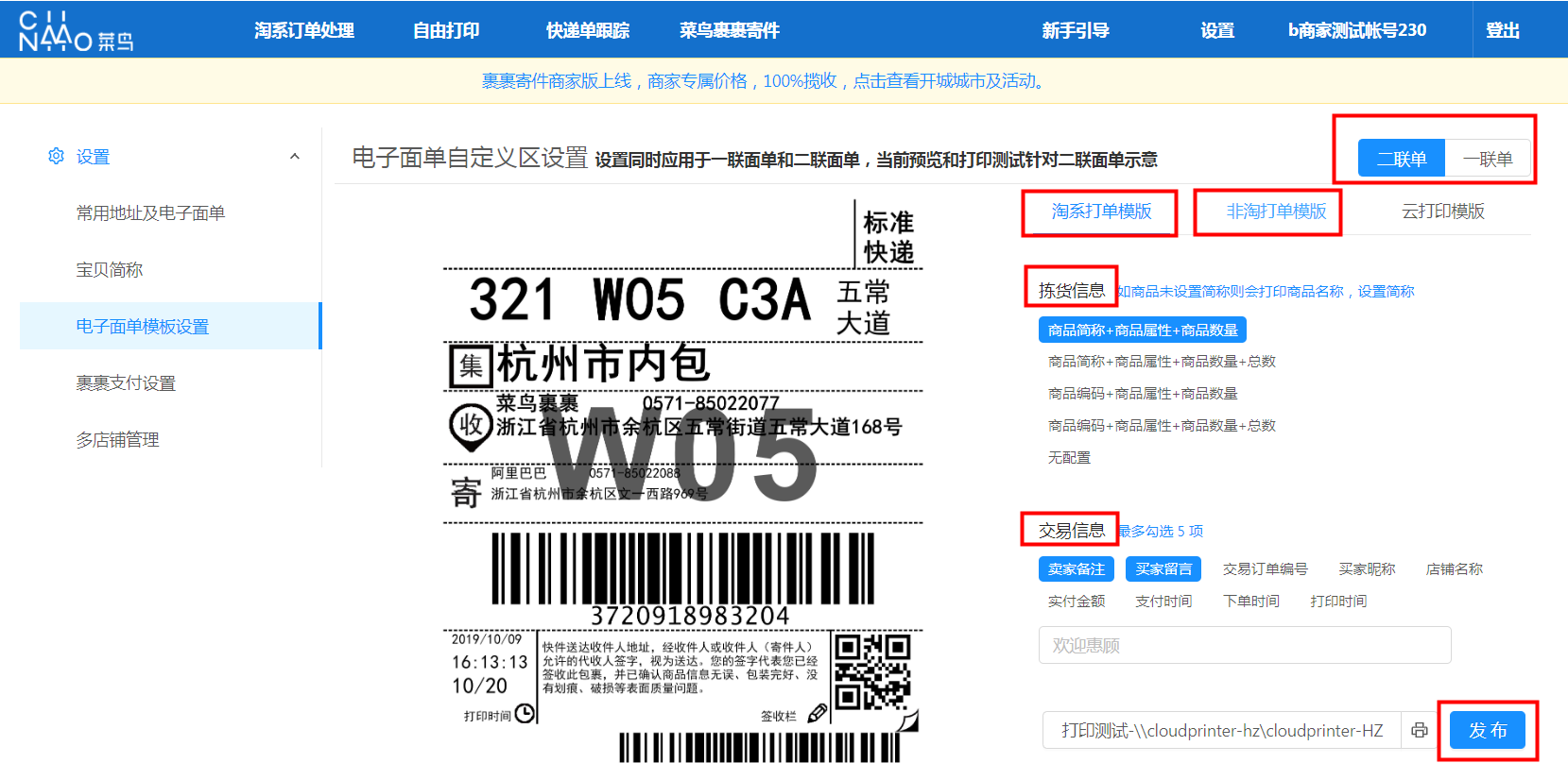 选择淘系/非淘打单模板,勾选所需的拣货信息和交易信息,点击发布后模板生效,打印的面单自定义区即可展示所编辑的信息。模板对应打单时的“自定义模板”选择项。