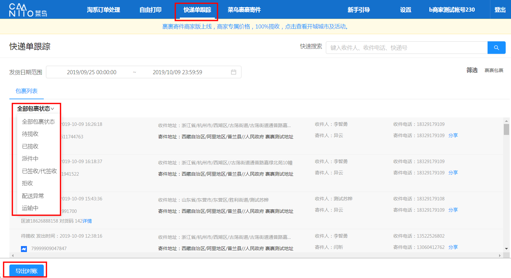 商家可在本页面查看包裹状态,进行对应物流状态的包裹物流详情跟踪。同时支持导出对账。