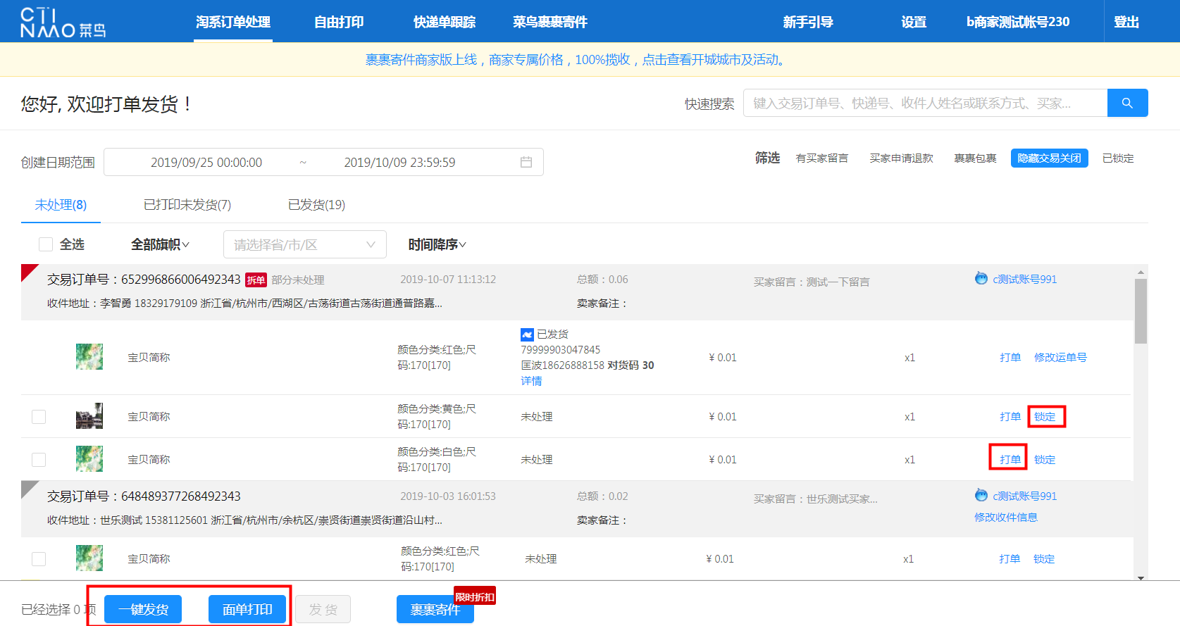 所有淘系同步过来的初始订单会展示在未处理页面,本页面可以对需特殊处理的订单操作锁定/解锁操作,锁定的订单无法进行批量操作。同时支持订单的一键发货和面单打印操作。操作页面展示如下: