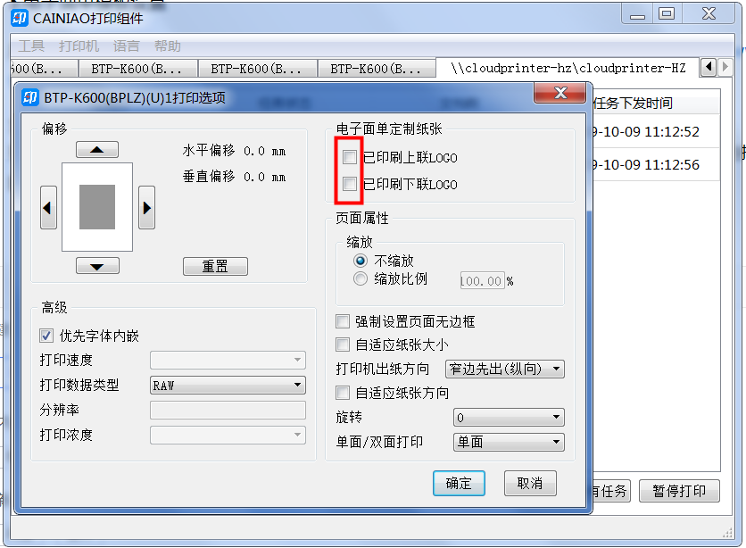 打开菜鸟打印组件应用,点击打印机,点击打印选项,选择指定的打印机。如图所示,勾空为打印上下联logo,选中则为不打印上下联logo。