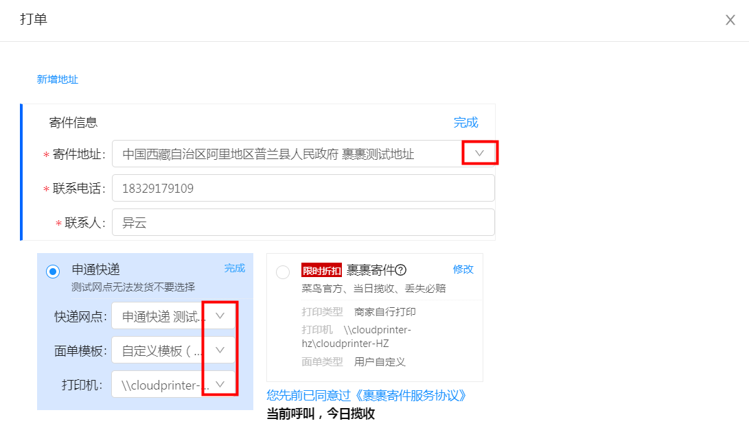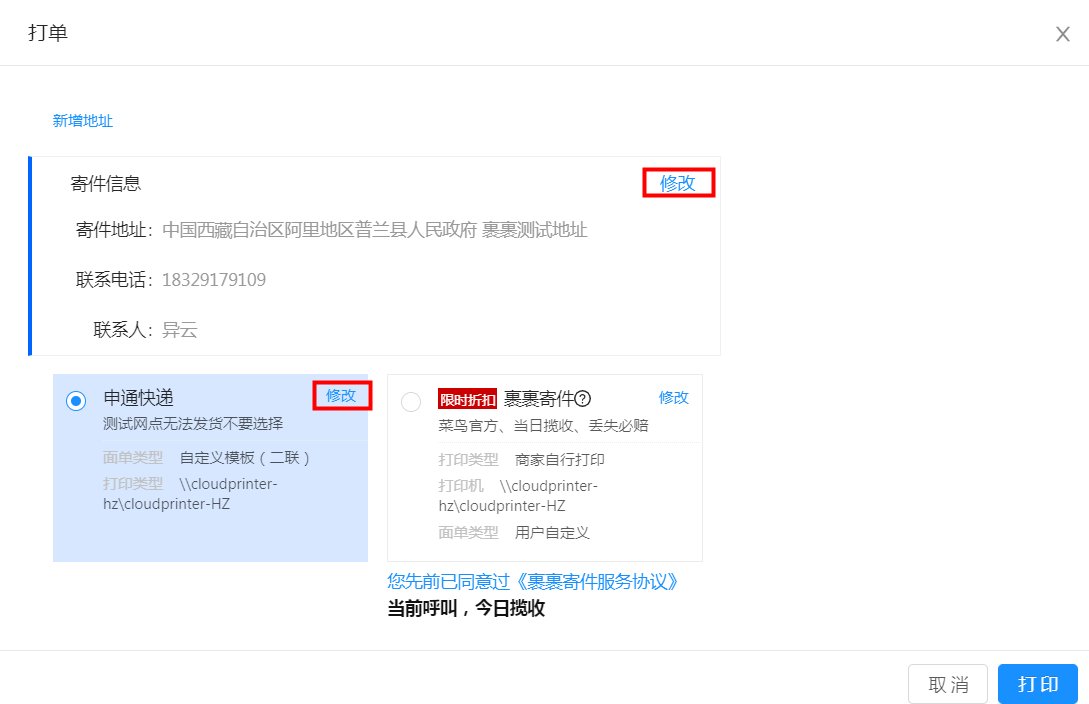 在打单页面,商家点击“修改”按钮,可以修改寄件信息、取号网点、电子面单模板和打印机,页面如下:
