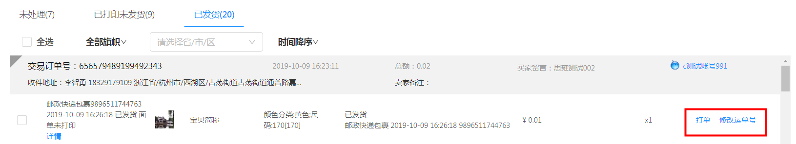 本页面展示已经操作了发货(含部分发货)的订单,商家可以操作再次面单打印或者修改运单号。