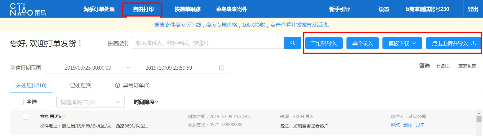 针对淘外(非淘系)的订单,支持商家二维码录入、在线单个录入、批量录入,订单导入成功后将展示在未处理页面。Excel批量录入上限5000条,如果Excel导入信息填写不完整,订单信息会显示在异常订单里面,在线进行修改即可。页面如下: